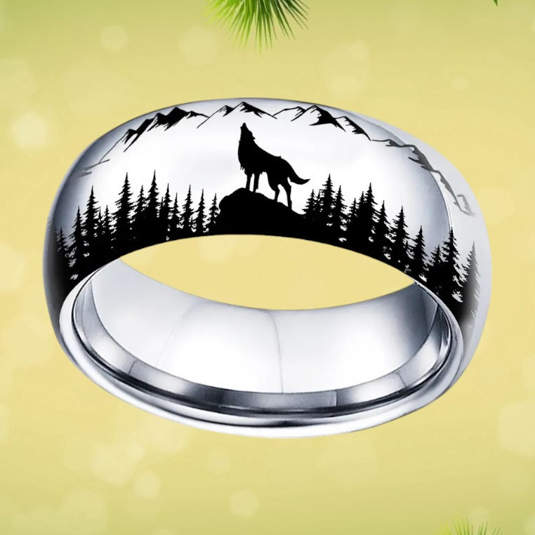 Додайте сили та стилю з цією чоловічою каблучкою із зображенням вовка, що виє на місяць у лісі біля гір! Мінімалістичний і потужний дизайн втілює дух свободи та природи. Каблучка ідеально підходить для повсякденного носіння, тематичних заходів або як подарунок на День народження, Різдво. Цей аксесуар — втілення мужності та характеру!