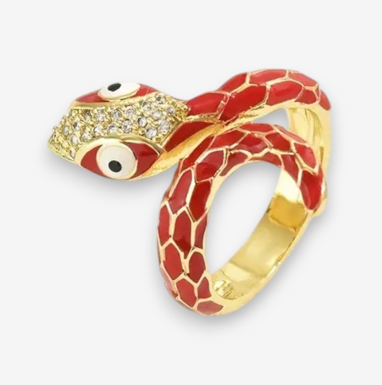 Елегантна каблучка у вигляді червоної змії з унікальним узором у стилі хіп-хоп. Регульований розмір робить її зручною для щоденного носіння, а яскраве золотисте виконання надає каблучці особливого стилю. Це прикраса стане чудовим подарунком для любителів оригінальних аксесуарів.